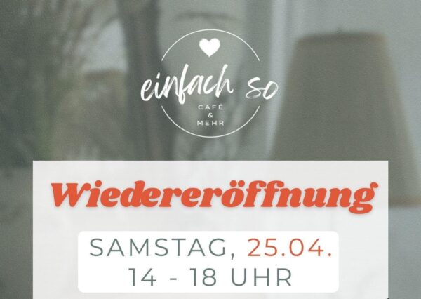 Am 25. April 2026 öffnet das Café „einfach so“ wieder die Türen! Achtung, jetzt in der Klosterstraße 7-7A, in 32545 Bad Oeynhausen! Herzliche Einladung, vorbeizukommen!