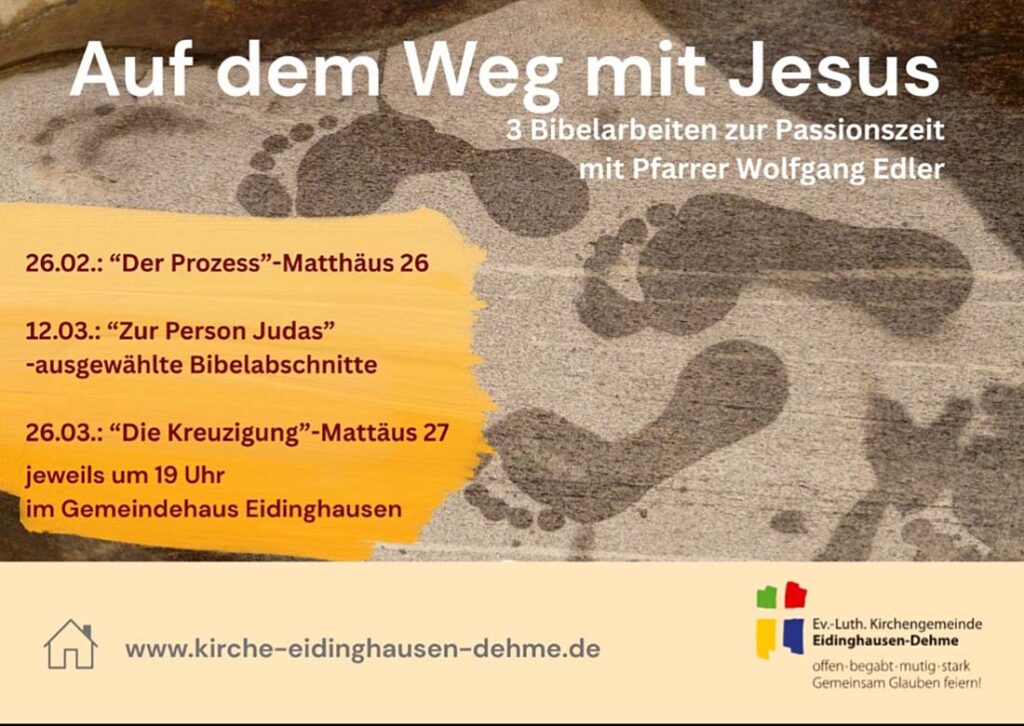 Dazu bietet Pfarrer Wolfgang Edler alle zwei Wochen in der Passionszeit jeweils donnerstags, 19.00h,im Gemeindehaus Eidinghausener Str. 133, Bibelarbeiten zu ausgesuchten Bibelabschnitten an, in erster Linie aus dem Matthäusevangelium.