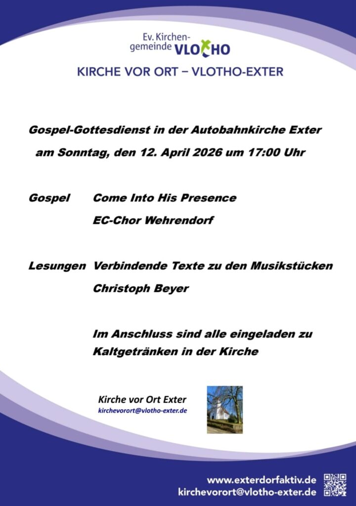 Herzliche Einladung zum Gospel-Gottesdienst in der Autobahnkirche Exter am Sonntag, den 12. April 2026 um 17:00 Uhr.
